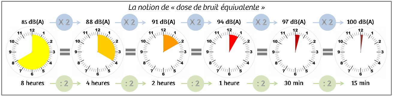 Les facteurs influençant la survenue de conséquences fonctionnelles néfastes pour l’audition sont le niveau et la durée (effet cumulatif) ainsi que la fréquence du bruit et son caractère impulsionnel. C’est pourquoi les normes sont exprimées en iso-énergie ou en « dose de bruit équivalente », c’est à dire en niveau sonore continu équivalent pendant une durée donnée.