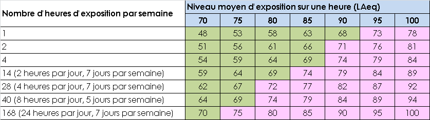 Moyenne annuelle exprimée en LAeq,24h selon la combinaison du niveau d’exposition horaire et du nombre d’heures d’exposition par semaine (source : OMS 2018) – Note : vert = combinaison de niveau et de durée d’exposition permettant de respecter la valeur recommandée par l’OMS ; rose : combinaison de niveau et de durée d’exposition dépassant la valeur recommandée par l’OMS