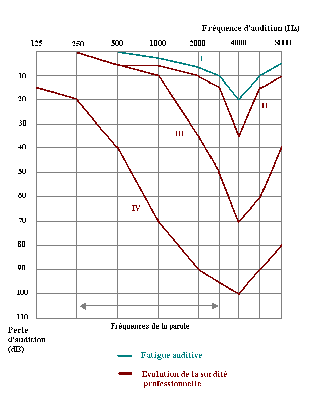 A partir d’une exposition à un niveau de 70 dB(A) pendant plusieurs heures, des signes de fatigue auditive peuvent apparaître. Les dangers pour l’audition sont avérés pour des expositions chroniques à des niveaux atteignant ou excédant 80 dB(A) sur 8 heures. En outre, un son très intense, autour de 120 dB(A) génère de la douleur et entraîne immédiatement des lésions importantes et irréversibles pour les tympans et les structures ciliaires de l’oreille interne. Des ruptures ciliaires définitives peuvent notamment se produire avec des sons de durée très brève appelés sons impulsionnels et d’intensité supérieure à 130 dB. Il est important de noter que le seuil d’apparition de la douleur est très supérieur aux niveaux d’apparition des premiers risques pour l’oreille (70-80 dB(A)), d’où l’importance de la mise en place de mesures préventives.